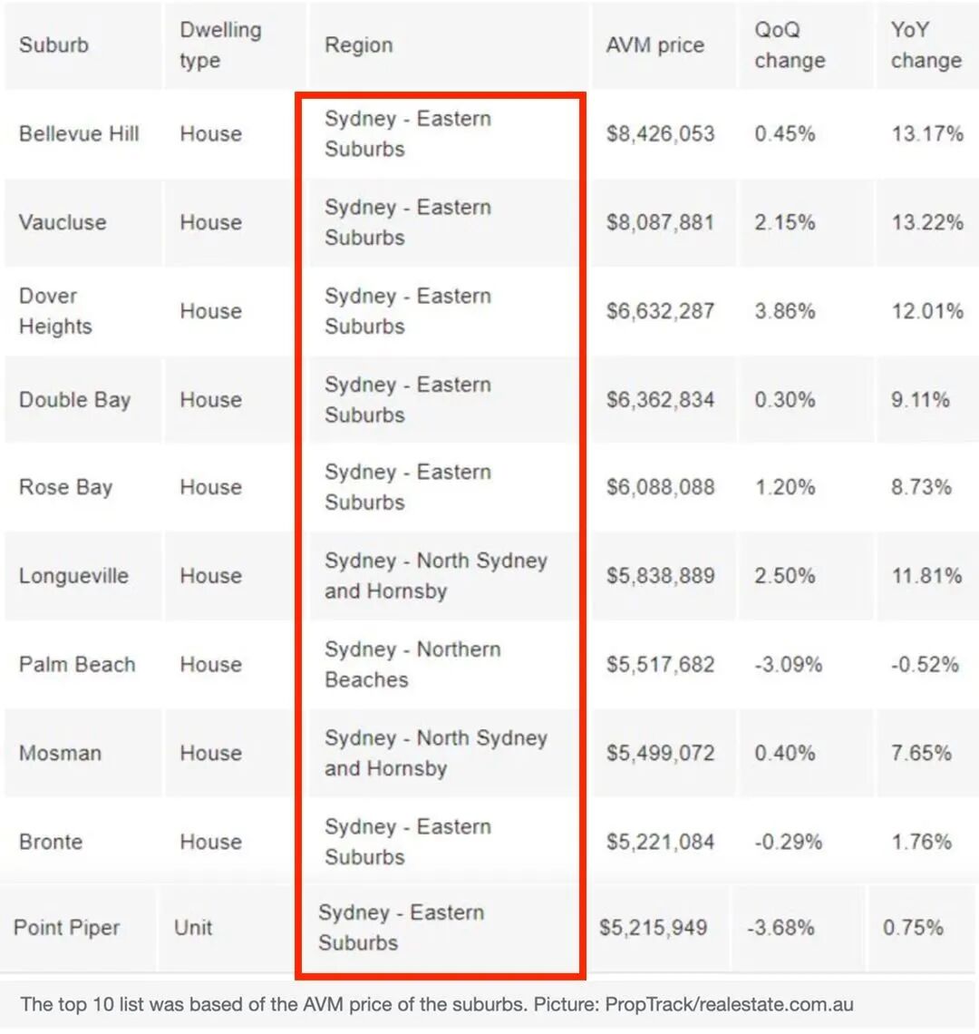PropTrack最近發布了其最新的季度自動估值模型 (AVM),該模型揭示了:全澳zui貴的十大街區全部都在悉尼!