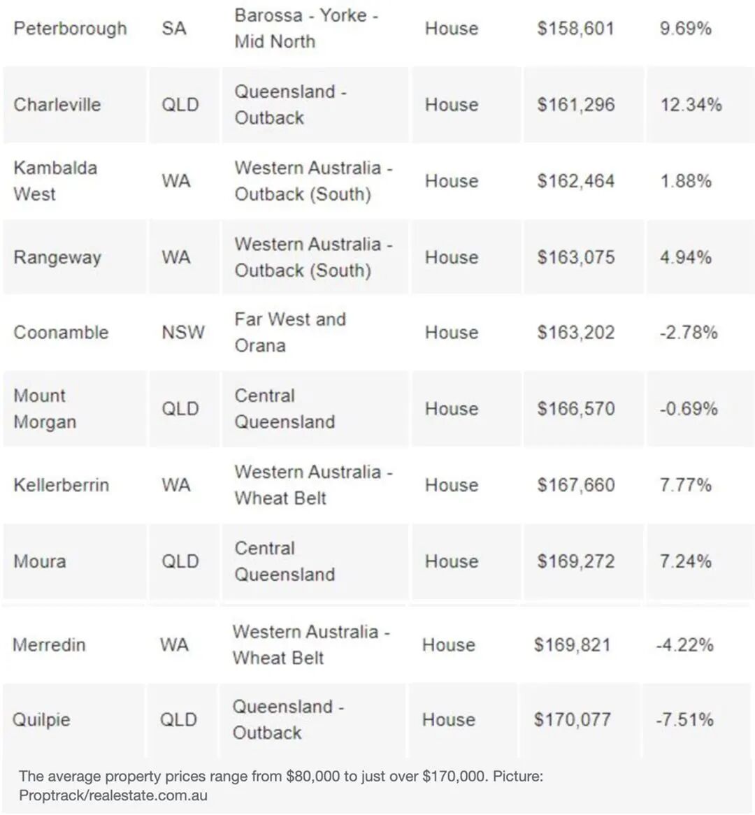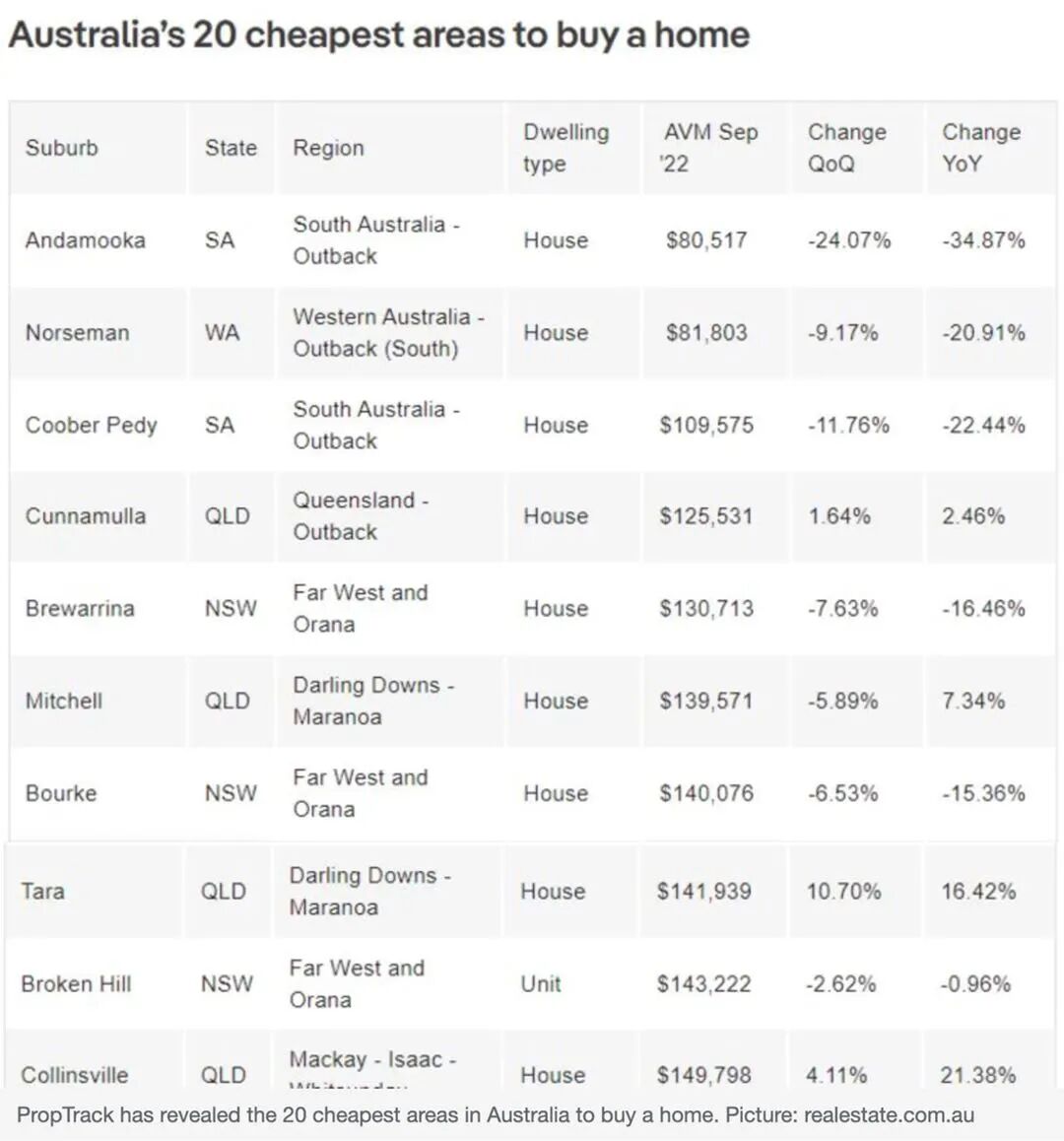 PropTrack發布的最新季度自動估值模型(AVM)中,公布揭示了全澳房價ZUI便宜的20個地區:其中大部分位于西澳和昆州!
