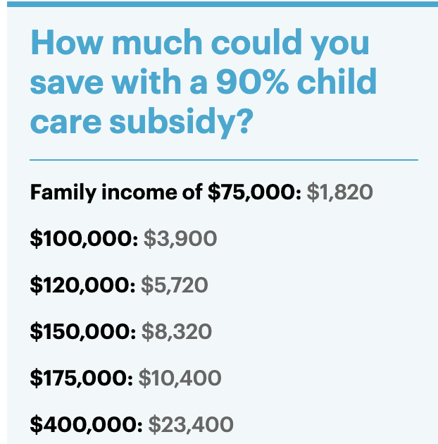從2023年7月起,對總收入低于8萬澳元的家庭,補貼率將從85%提高到90%。年收入每增加5000澳元,補貼將減少1%,收入超過53萬澳元時,則無法獲得補貼。新的補貼政策到底可以幫澳洲家庭省下多少錢?