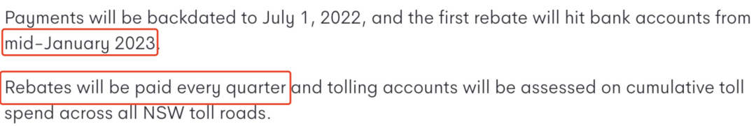 自從通行費減免計劃公布以來,大家一直關心什么時候能拿到這筆錢。悉尼車主們注意啦,第一次回扣將從2023年1月中旬開始轉入大家的銀行賬戶中,退款將每季度支付一次!