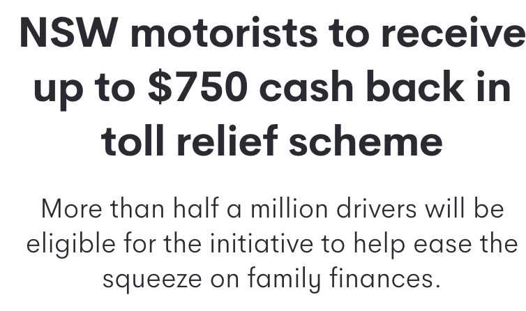 今年,新州政府推出了一項通行費減免計劃,要把數百萬澳元的通行費按回扣的方式退還給大家。這項通行費減免計劃,可以幫助悉尼車主們拿回: