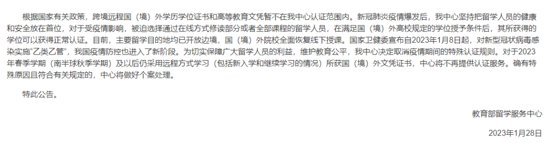 對于有特殊情況,因客觀原因無法在2023年春季學期(南半球秋季學期)返校的留學人員,須留存好與此相關的書面證明材料,并在獲頒文憑證書后,提交認證申請時一并提供。我中心將結合具體情形,完成對相關文憑證書的個案評估。