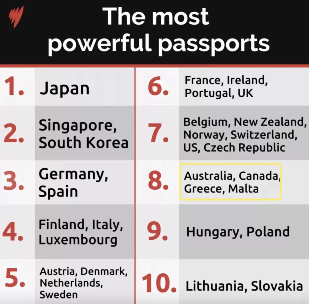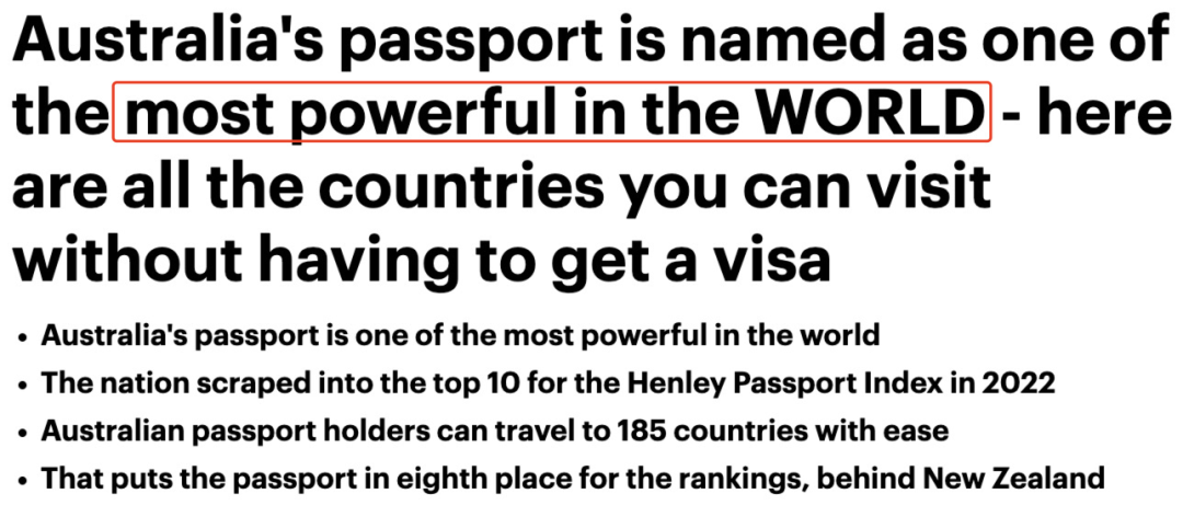 據英國國際交流咨詢公司公布的《2023年第一季度全球移動報告》指數顯示“在199個國家當中,澳洲HZ含金量排名全球前八!與加拿大和希臘并列,是世界上Zui強大的HZ之一!”