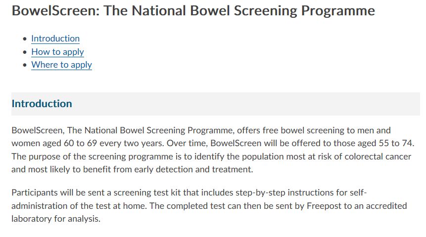 處于55-74周歲的女性和男性,每兩年可享受一次免費的腸癌檢查。