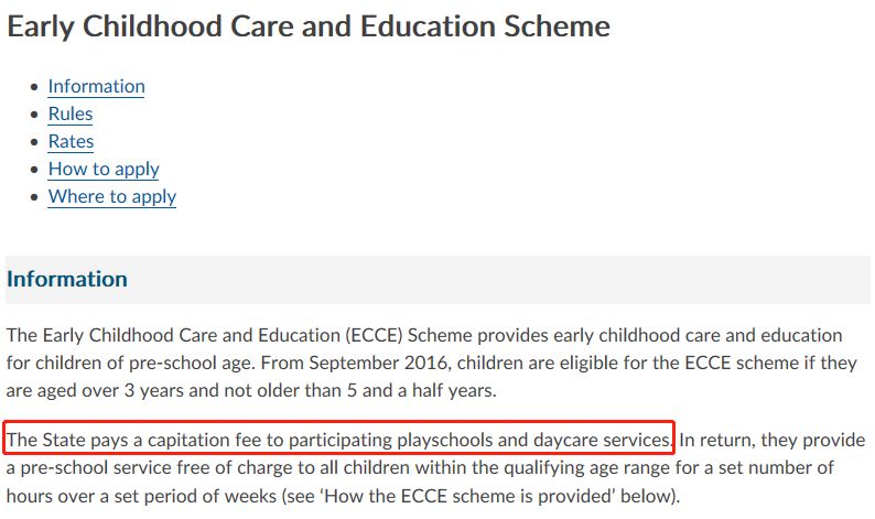 愛爾蘭政府推出“可負擔保育計劃”(簡稱ACS計劃),旨在減輕父母的經濟負擔,以確保每個愛爾蘭的孩子都能接受幼兒教育與托管服務。分為:針對性家庭保育補貼和普遍保育補貼。