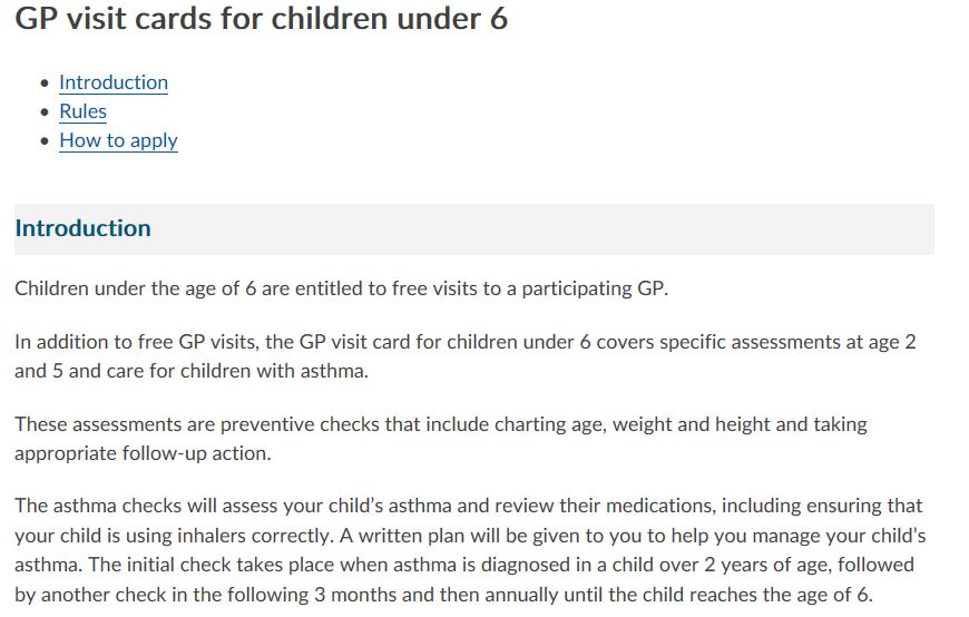 愛爾蘭政府為6周歲以下的兒童提供免費的GP醫療訪問卡。