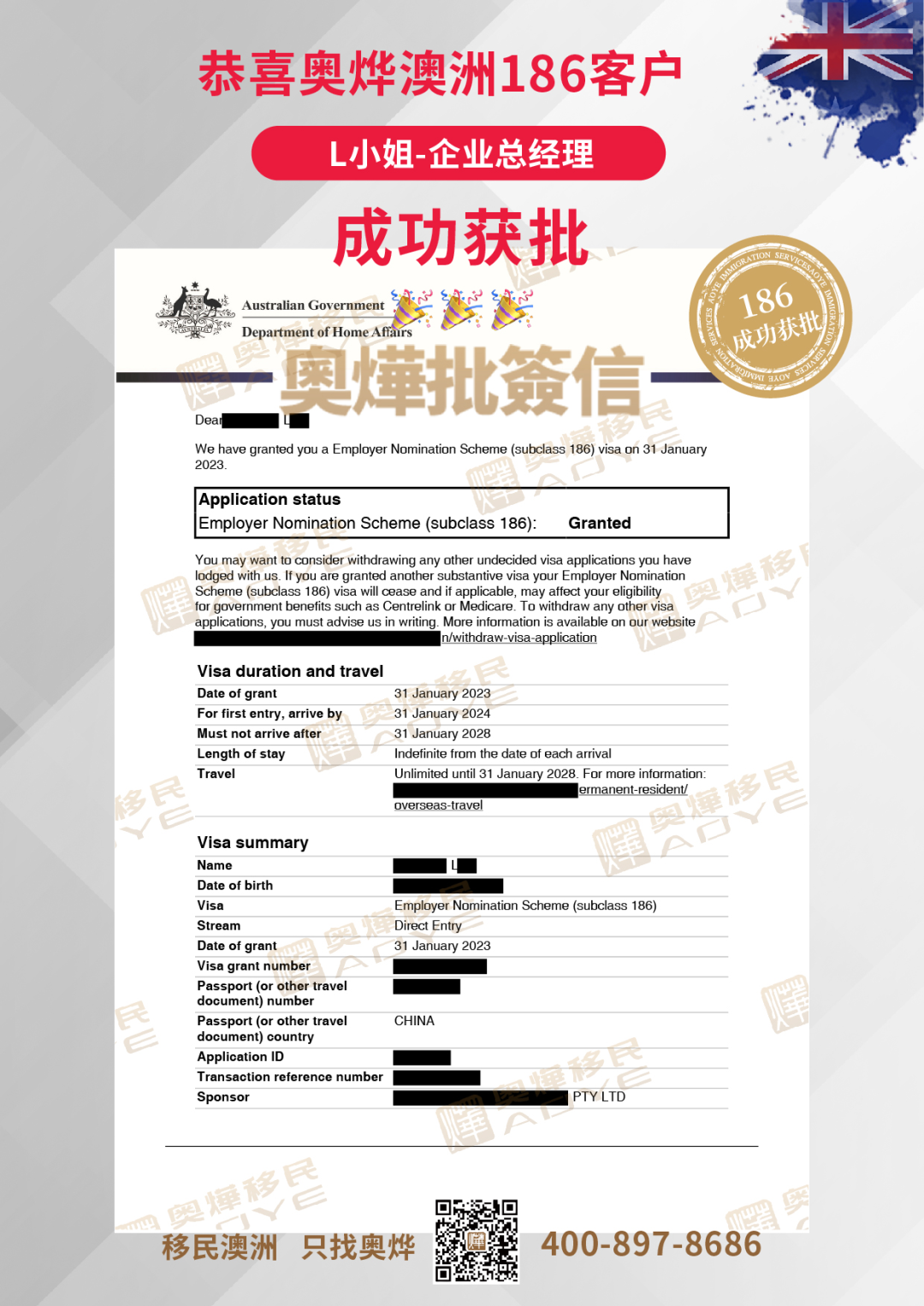 個案背景:L小姐從業于香港某大型企業,擔任部門總經理一職。經親戚(奧燁188A老客戶)轉介紹與奧燁結緣,委托申請辦理澳洲雇主擔保移民186簽證。